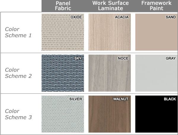Please consider all factors influencing color perception when choosing panel fabric, work surface laminate, and trim paint colors. Natural or artificial light, time of day, and surrounding hues in your office environment, all can influence one's visual perception of color.